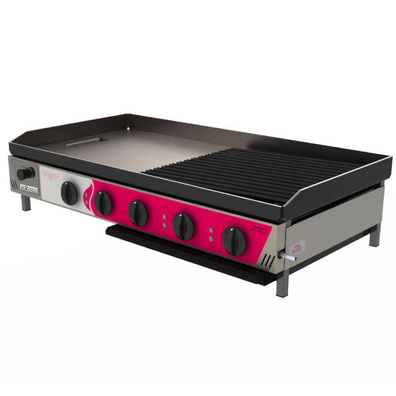 Descripción: Chapa reforzada para fritura con quemadores móviles, perfecta para cocinas que requieren robustez y movilidad térmica.